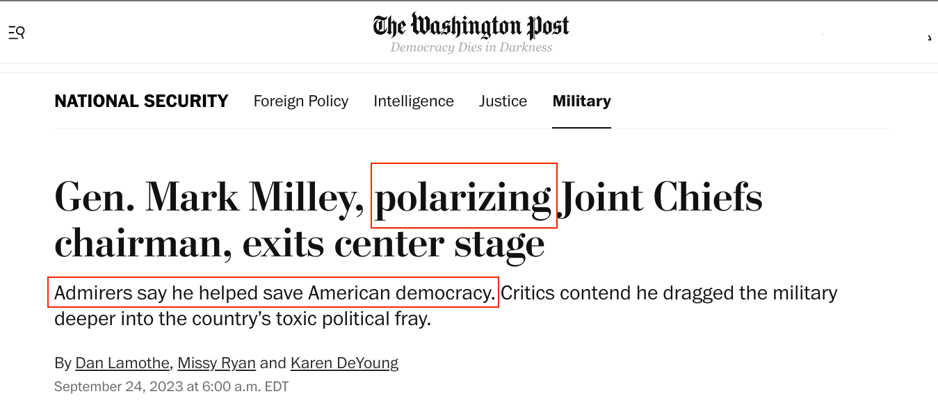 Yet that is how the Post of this era decided to frame the departure of Milley, who had tried to insulate the military (and its nuclear weapons) from impetuous misuse by Trump. The Post headline appeared even after Trump ranted that Milley should face the death penalty for his “treasonous” disloyalty to Trump himself.
