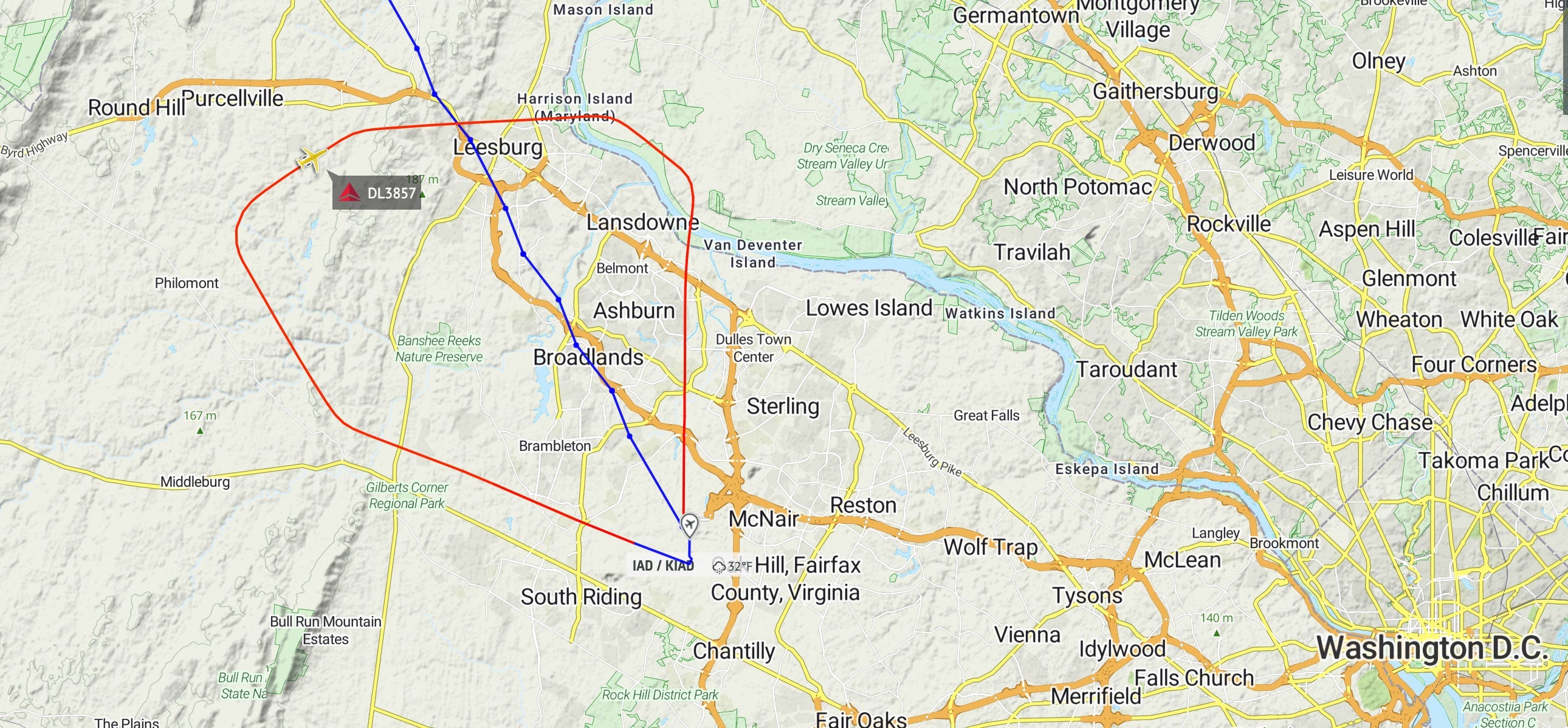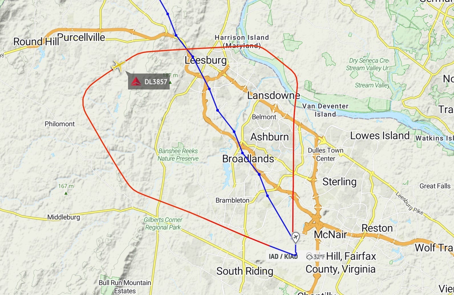 A commuter airline, “SkyWest 3857,” which passengers would think of as a Delta regional flight, takes off from Dulles, at the bottom point of the red-line pattern. It is headed for Minneapolis-St. Paul. Eventually its path was supposed to converge roughly with the blue line pointing up to the northwest, toward Minnesota. It’s normal for planes to be given an indirect course on their immediate routing away from a busy airport.