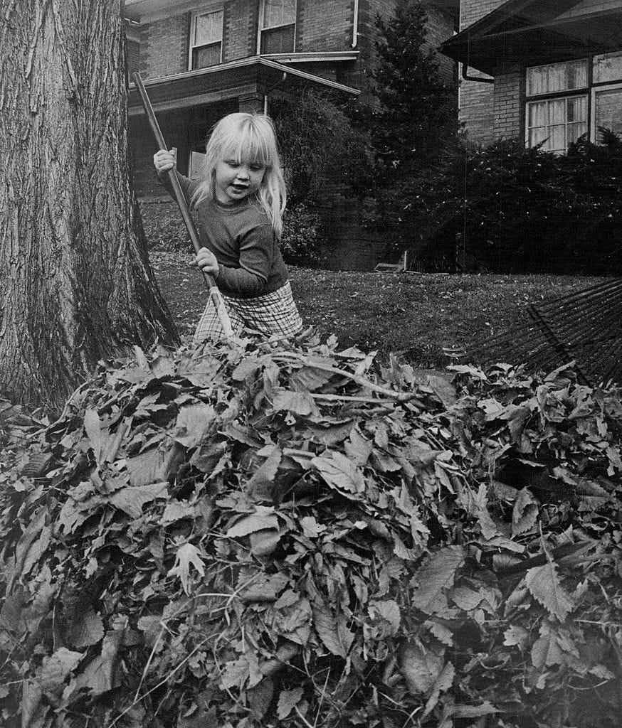 This photo ran in the Denver Post 49 autumns ago, in 1974. It is of young Ellen McKay, then age 4, raking leaves. The picture has a time-capsule quality, in capturing one of the last leaf-raking seasons before gas-powered blowers transformed the rituals and sounds of this season, and eventually all seasons, in much of the United States. (Ira Gay Sealy/Denver Post via Getty Images)