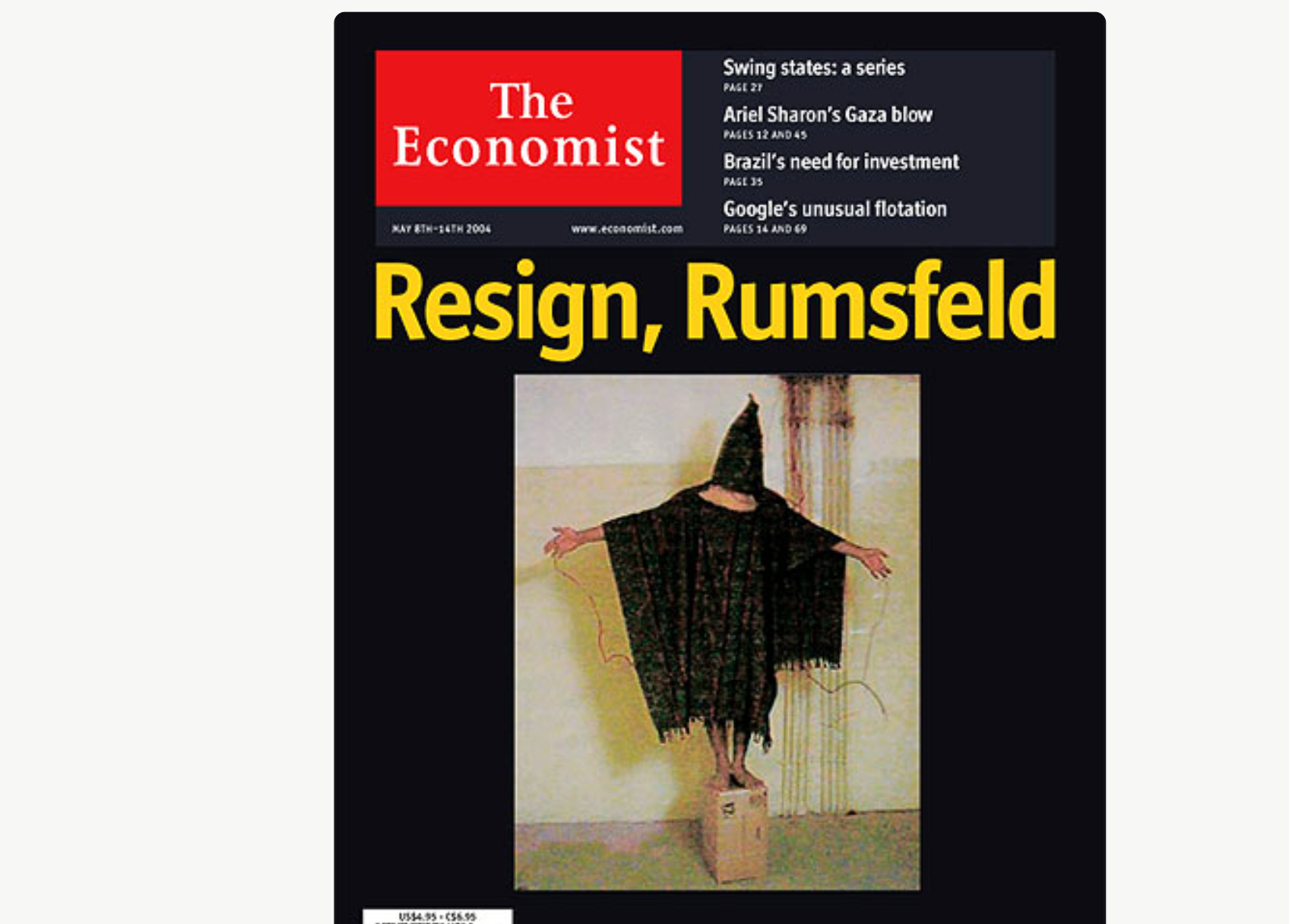 Investigative stories about American abuse and torture at Abu Ghraib might on their own have brought reaction and outrage. But nothing could match the effect of on-scene photos. Their impact was such that The Economist used one of them as its cover: