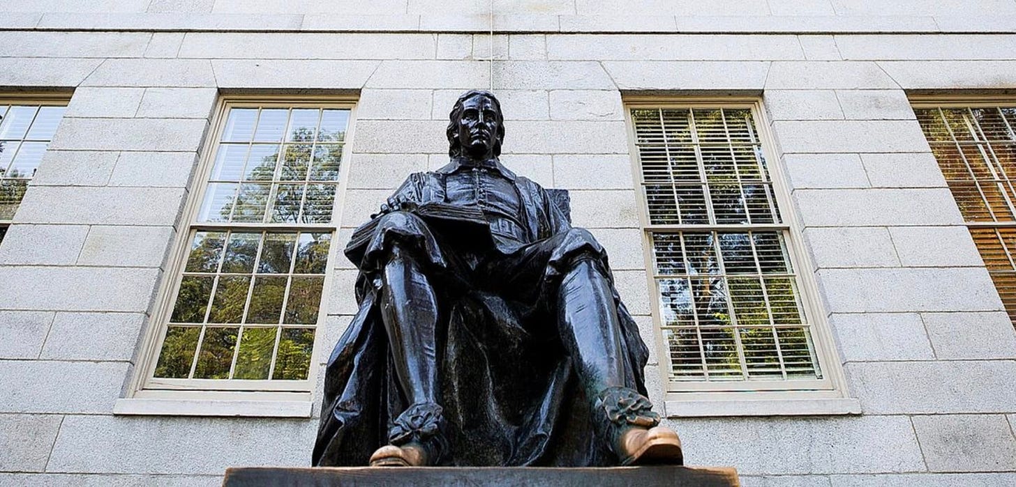 Famous statue of a seated John Harvard, by Daniel Chester French, in Harvard Yard. The toes of John Harvard’s shoes are shiny because of the endless stream of visitors rubbing them for good luck, presumably with the admissions office. On April 14, 2025, the university’s leaders stood up and took a bold step in keeping with the institution’s status, power, and stated values. (Harvard Gazette photo.)