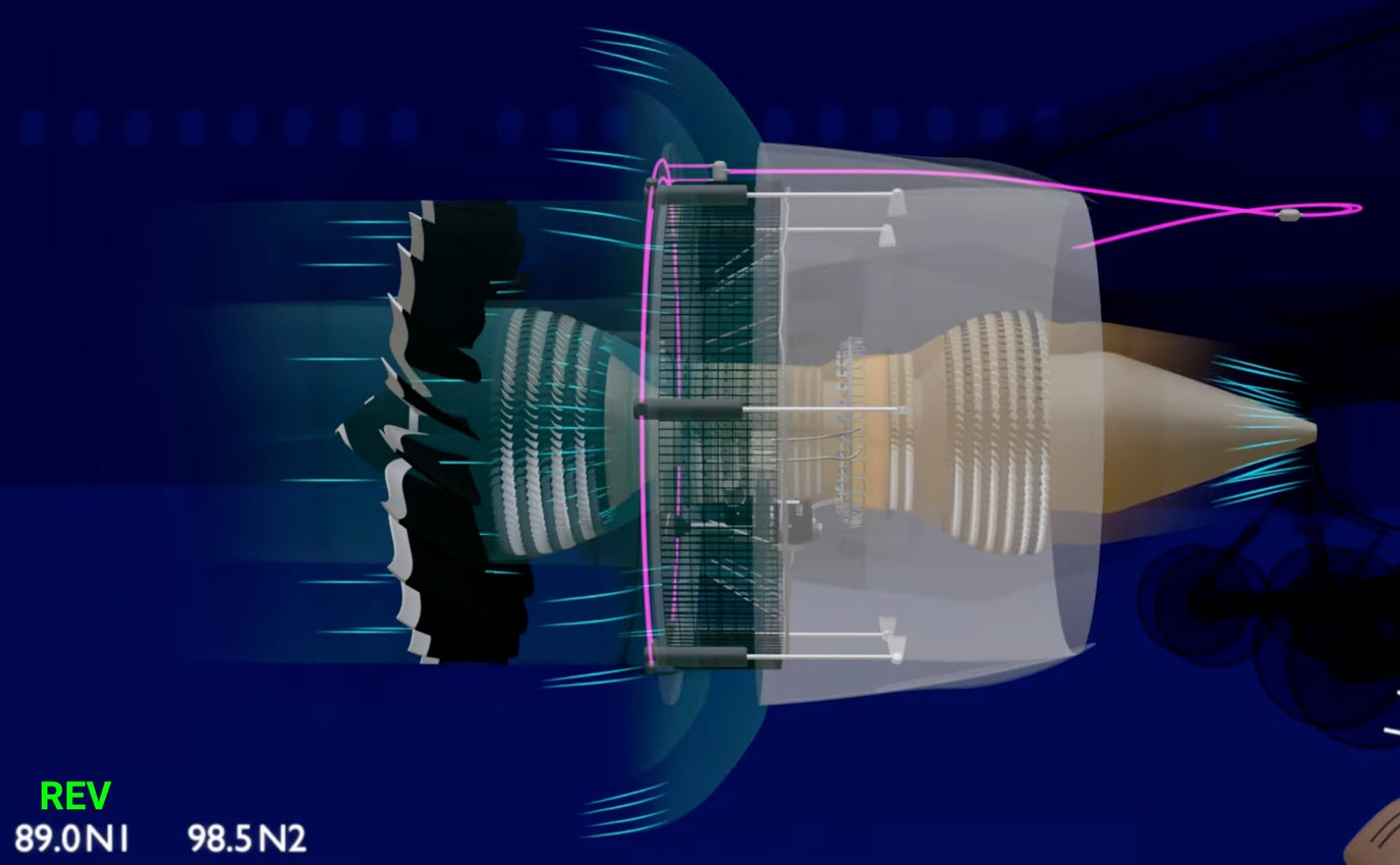 An illustration from a GE video, showing what happens when an aircraft jet engine goes into “thrust reversal” mode and suddenly slows the plane down rather than speeding it up. This happened to a FedEx crew recently in Toronto. What happened next was remarkable. (YouTube via Aircraft Science.)
