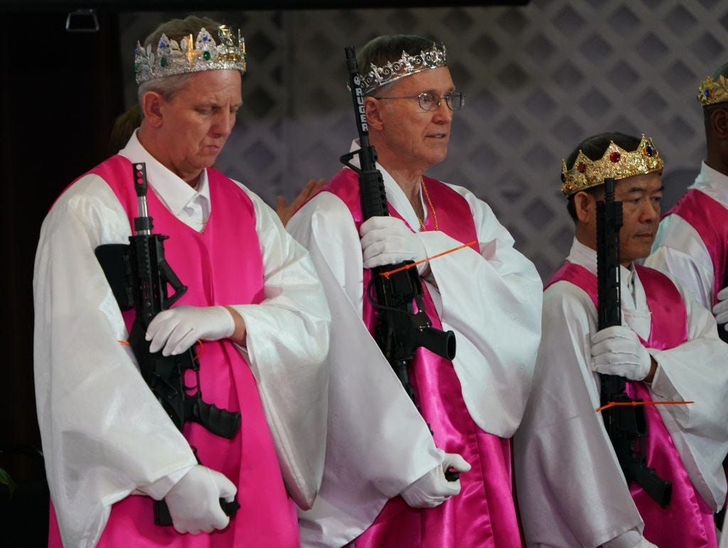 By the early 2020s, AR-15s had become cult and tribal objects, in addition to deadly weapons. Early this year, two first-year Republican congressmen (one of them George Santos) wore AR-15 lapel pins in the Capitol. For his Christmas greeting in 2021, Rep. Thomas Massie sent out this image, part of a trend for other family-with-guns photos from public figures. Those I’ve seen from politicians have all been from Republicans.