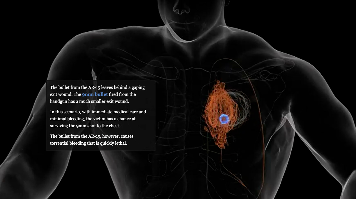 It showed exactly how human bodies, including the torsos and heads of little children, are blown apart by bullets from AR-15 rifles. That is in the Post’s online graphic feature, here, which went up two days ago. It includes detailed animations of the series of wounds that killed two students, six-year-old Noah Pozner in Newtown CT, and 15-year-old Peter Wang in Parkland FL. These careful recreations, based on autopsy and forensic reports, were shown with the families’ permission.