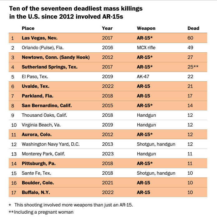 The AR-15 matters because it has been used in the majority of recent U.S. mass shootings—which are most of the world’s mass shootings. Here is an illustration from the recent WaPo coverage: