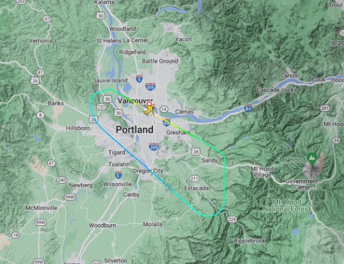 As for the where: from a FlightRadar24 map, here is the track of the plane. It took off from Portland to the northwest and made a climbing left-hand turn toward its en-route heading to the southeast. It had reached a speed of more than 400 mph and an altitude of around 16,000 feet when the door plug blew out. Then it managed an emergency return to Portland through the rest of the left-hand circuit. You can see another view of its track on FlightAware.