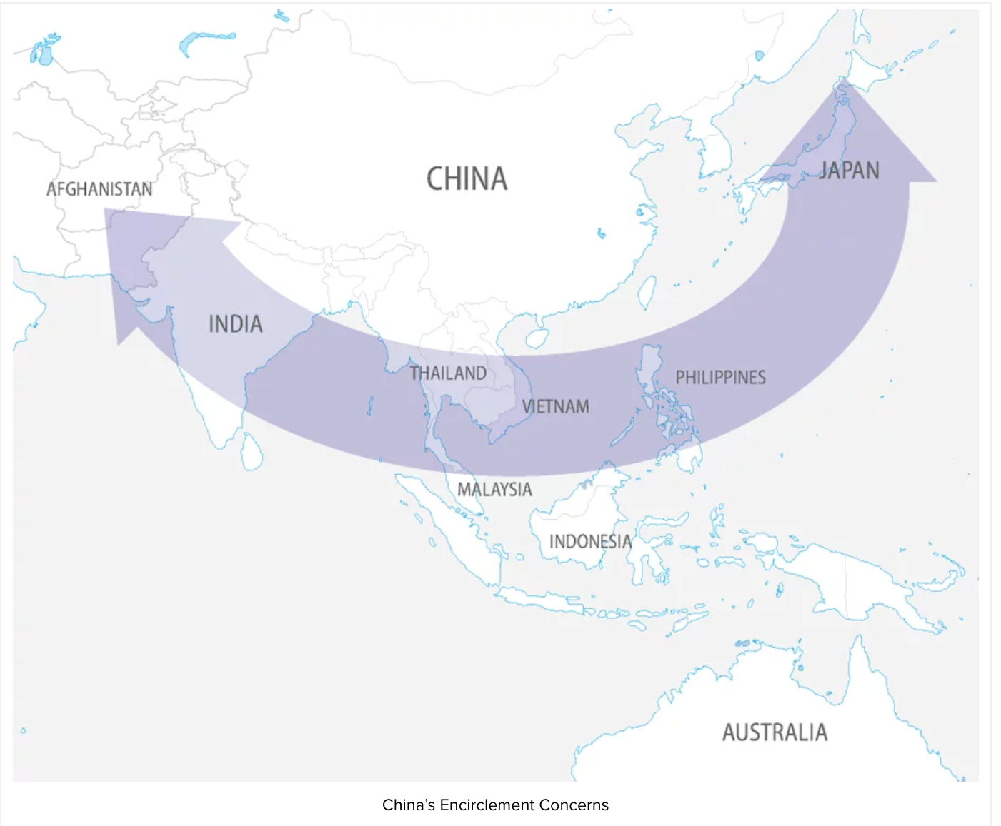 The encirclement view is long-standing and powerful among China officials. Recently I mentioned that about a dozen years ago, at the Chinese counterpart of West Point, I heard a detailed lecture on how their country was being surrounded by U.S. forces. The illustration below, from a Western think tank, gives the idea. (Though the maps I saw were more lurid, with big red arrows showing possible attack routes into China, and little American-flag icons marking places where U.S. and allied aircraft, ships, or troops could be based.)