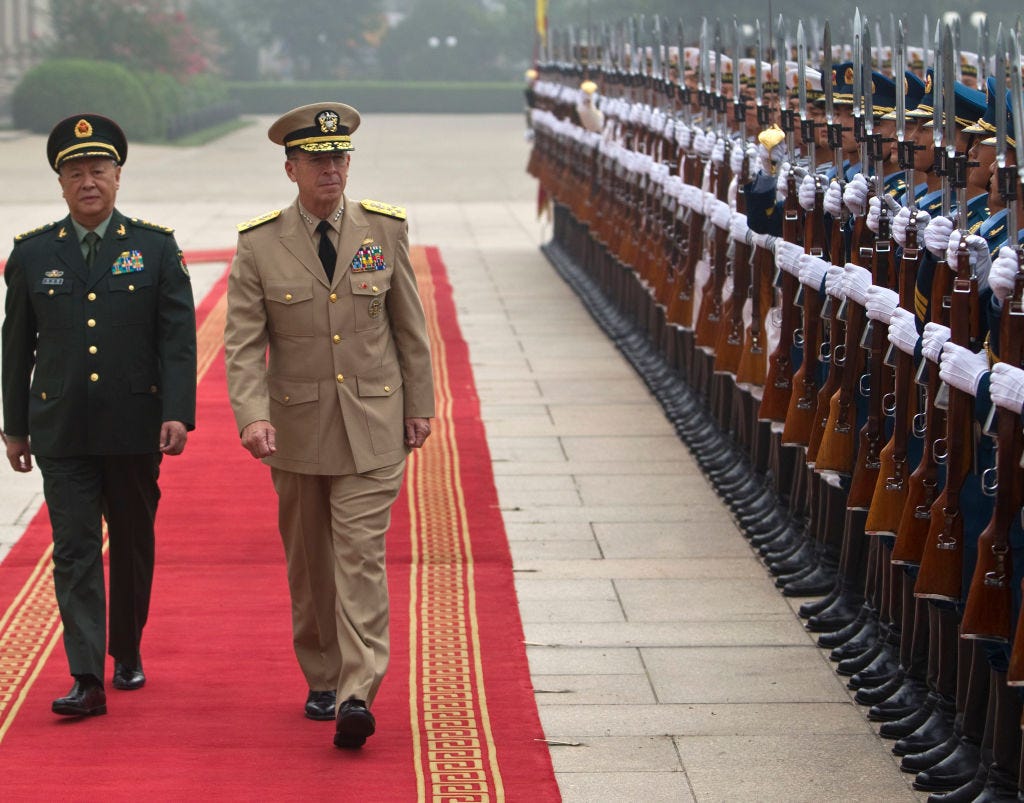 A few months later, Mullen paid a return visit to China. This photo is of the two commanders in front of PLA troops in Beijing.