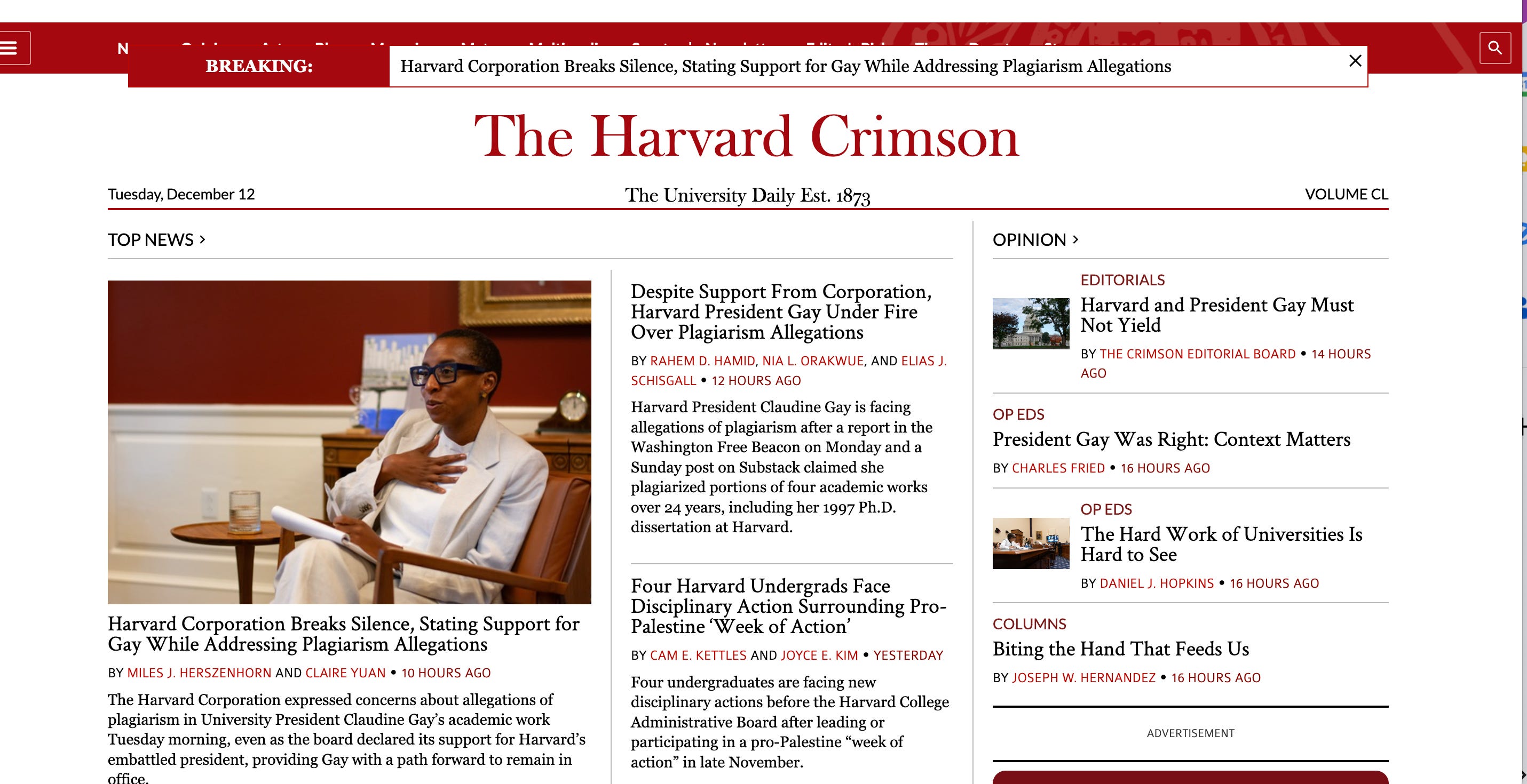 OOYB, Jim, describing the terrific job the Crimson kids (our descendants) are doing with their national story about the Harvard president. The website is not a magazine so you can't call up today's or yesterday's issue. Like the NYT site, which the Crimson kids have thoroughly whipped at every stage of this story. I'm sure all the pieces you mention are still available at https://www.thecrimson.com/ The plagiarism story has astounding detail and is so fair-minded. I agree with you about the editorial -- just so calm, logical and right. For the first time in five decades, I think they might be better than we were. Gosh.