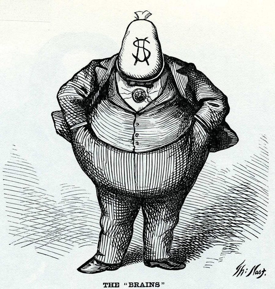A famous Thomas Nast cartoon from the 1870s. He put ‘Brains’ in quotes, but left the money bags without annotation. Ie, then and now. money makes people think they are smart. (Smithsonian Institution.)
