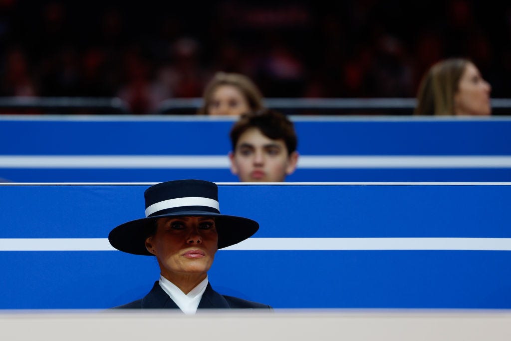 I am not an expert on body-language or clothing-language. But to a layman, everything about her attire, and her hat!!!!, signified: Stay away! “I really don’t care, do you?” Noli me tangere (“don’t touch me”), as the Filipino novelst Jose Rizal mylate Filipino friend, F. Sionil Jose[Sorry for error] put it in a book title. Even when Trump tried to peck her on the cheek, the hat brim prevented him from getting close enough. Accident? Intention? We’ll never know.First lady of all the people. (Photo by Anna Moneymaker/Getty Images)