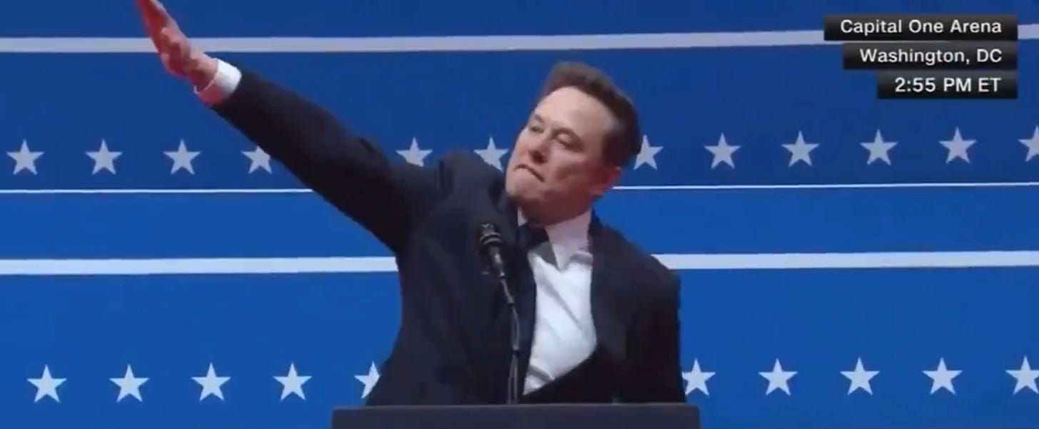 Here he was today at the post-ceremony celebrations at Capital One Arena. Our parents’ generation fought against the Nazis. Now we have someone who was grinning and clapping during an inaugural address, giving the Nazi salute, at an event for the new leader.You do don’t this by accident. I’m a generation older than Musk. As far as I’m aware, I have never given a Nazi salute. Let alone twice, on national TV, at a swearing-in ceremony.