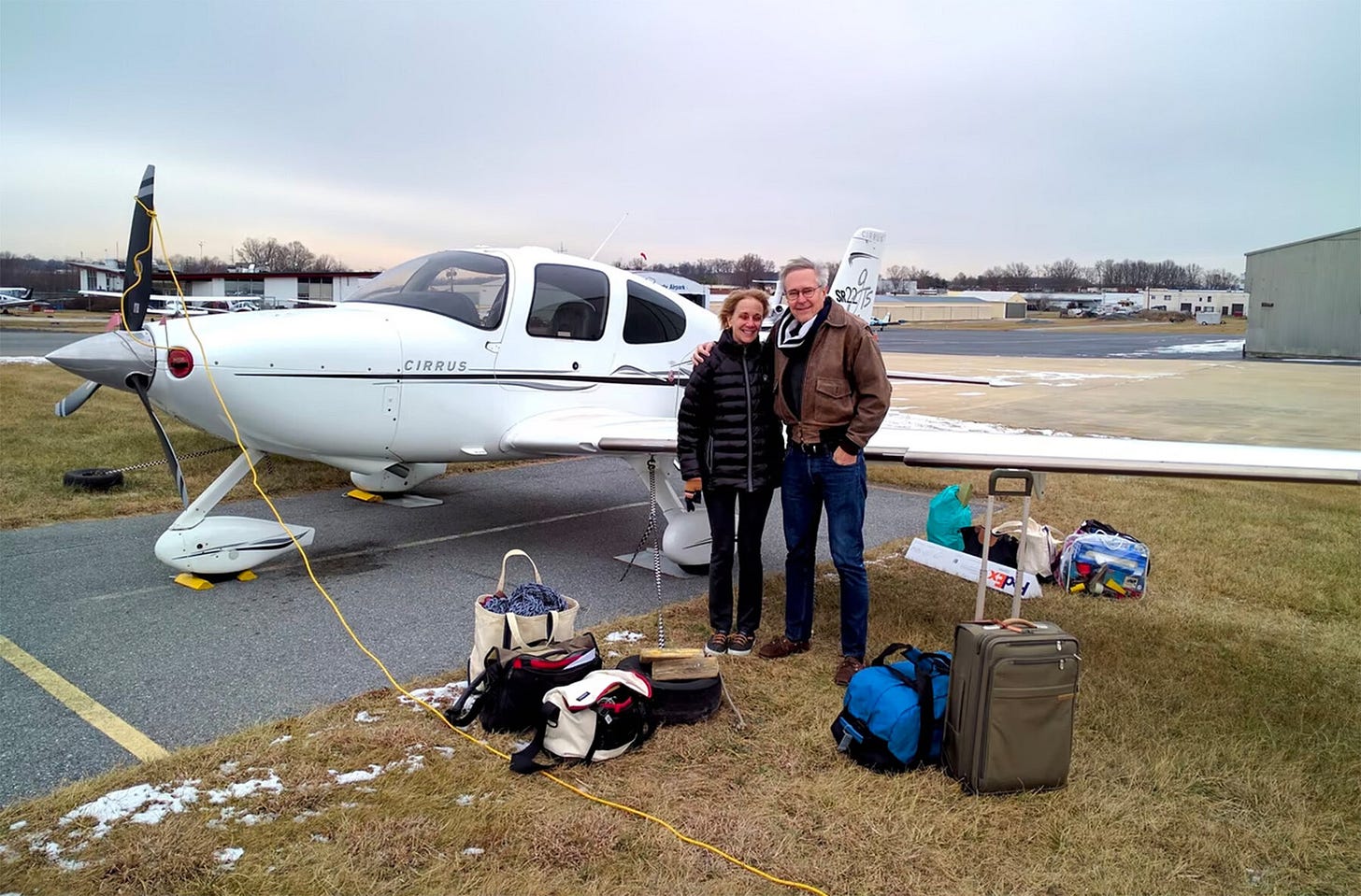 And eight years ago, at the beginning of the first term of Donald Trump, we took off in our little airplane for a long stretch in the California homeland, where we wrote the Our Towns book. This is how it looked before we took off from Gaithersburg airport, outside DC, in freezing weather shortly before the first Trump swearing in. (We got to Demopolis, Alabama, that night.)