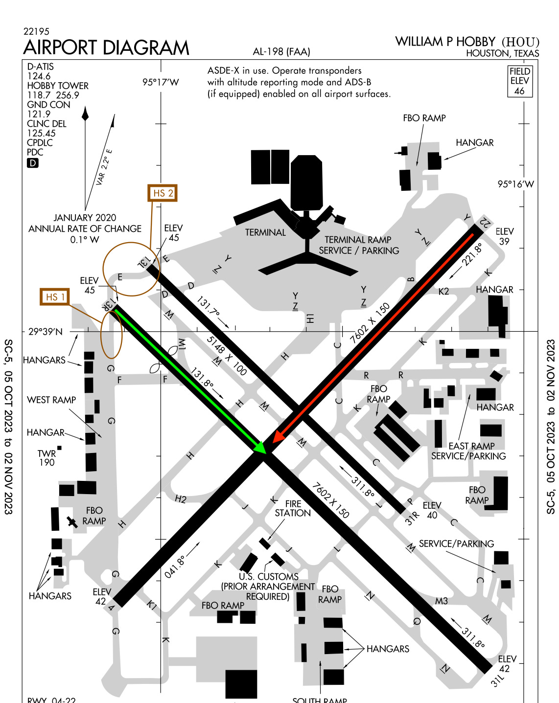 This is the official FAA diagram of Hobby airport, HOU. The annotations are by me, as explained below.