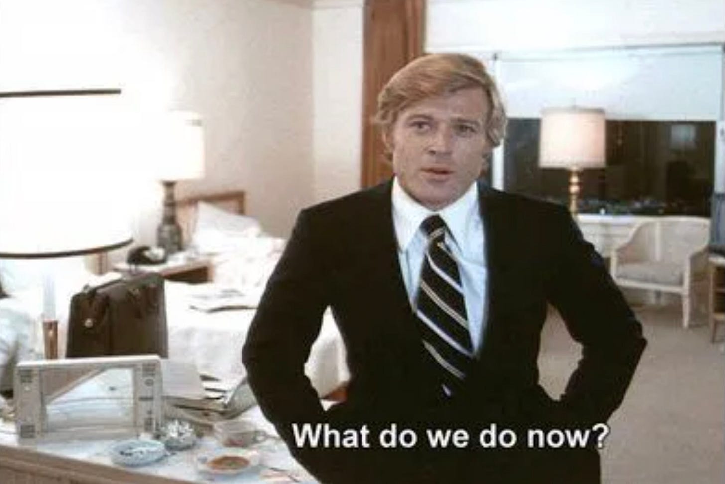 Closing scene in Robert Redford’s classic 1972 movie The Candidate. Redford’s long-shot candidate stages an unexpected victory. As the returns come in, he asks his advisors: What do we do now? Winning is one thing. Governing is different. Dems hope they’ll be in a position to ask—and answer—this question one year from now. (JF screenshot.)