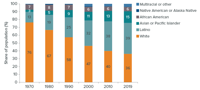 Fifty years ago, California’s population was three-quarters white. Twenty years ago, the white share was less than half. Now the Latino proportion is slightly larger than the white share, and California has become the classic “majority minority” state. (Even as the Census Bureau is avoiding those terms and, correctly, emphasizing the multiple identities people might claim.)